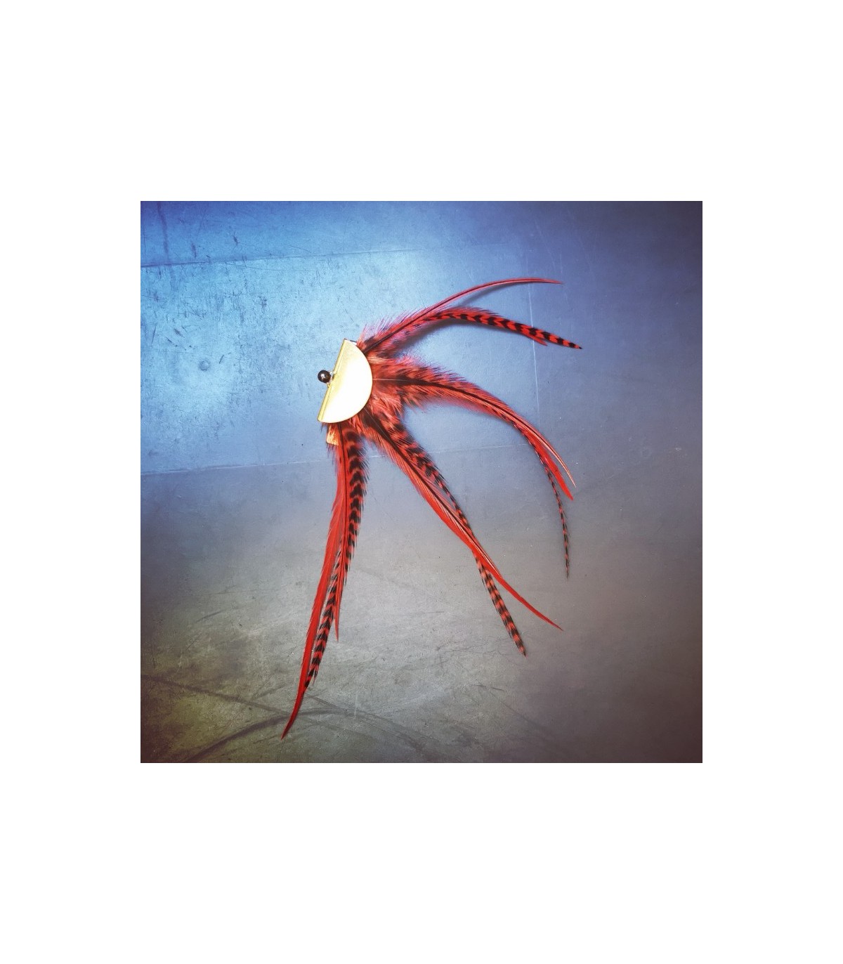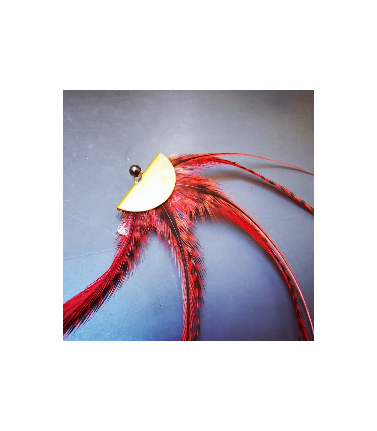 La barrette se compose de quatre bouquets de plumes naturelles, soigneusement sélectionnées puis teintées artisanalement, avant d’être montées en panache sur une demie-lune en métal plaqué or 18 carats. Une perle d’hématite vient délicatement parfaire l’ensemble, apportant une touche lumineuse et raffinée à cette création d’exception.
