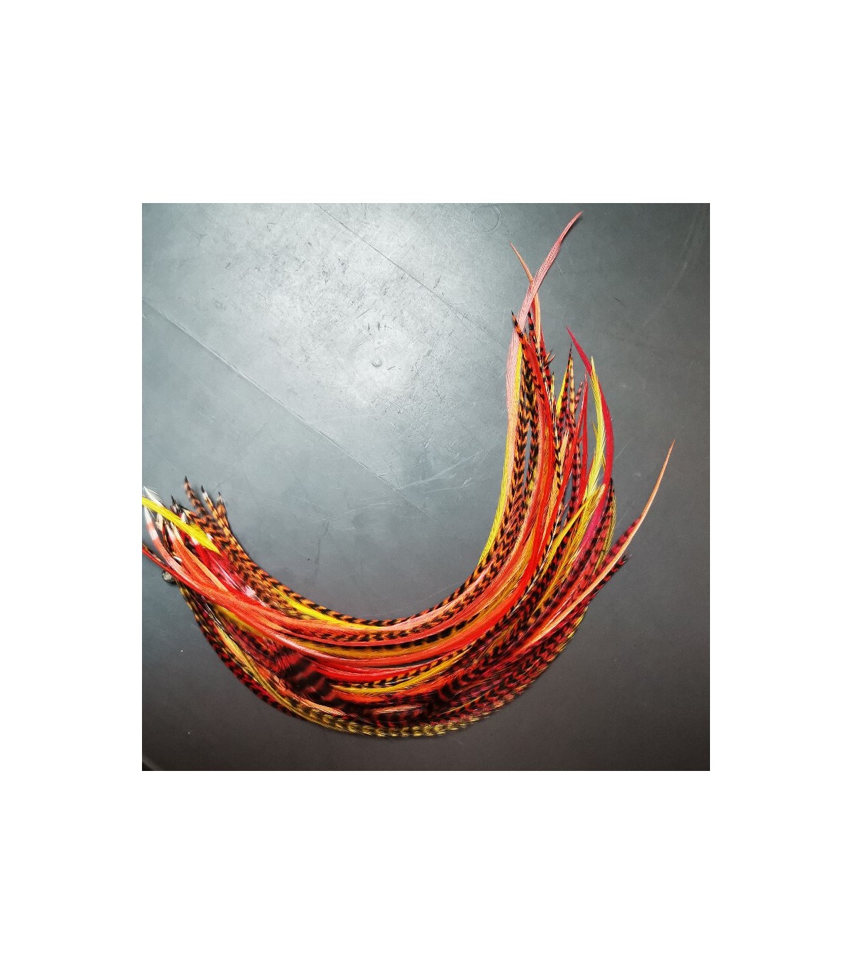 100 plumes naturelles fines en majorité avec quelques plumes de largeurs variées, dans un assortiment de différents tons de la gamme Sunset : Rouge pur, Orange intense, Corail fluo, Cerise, Jaune citron, Mordoré.